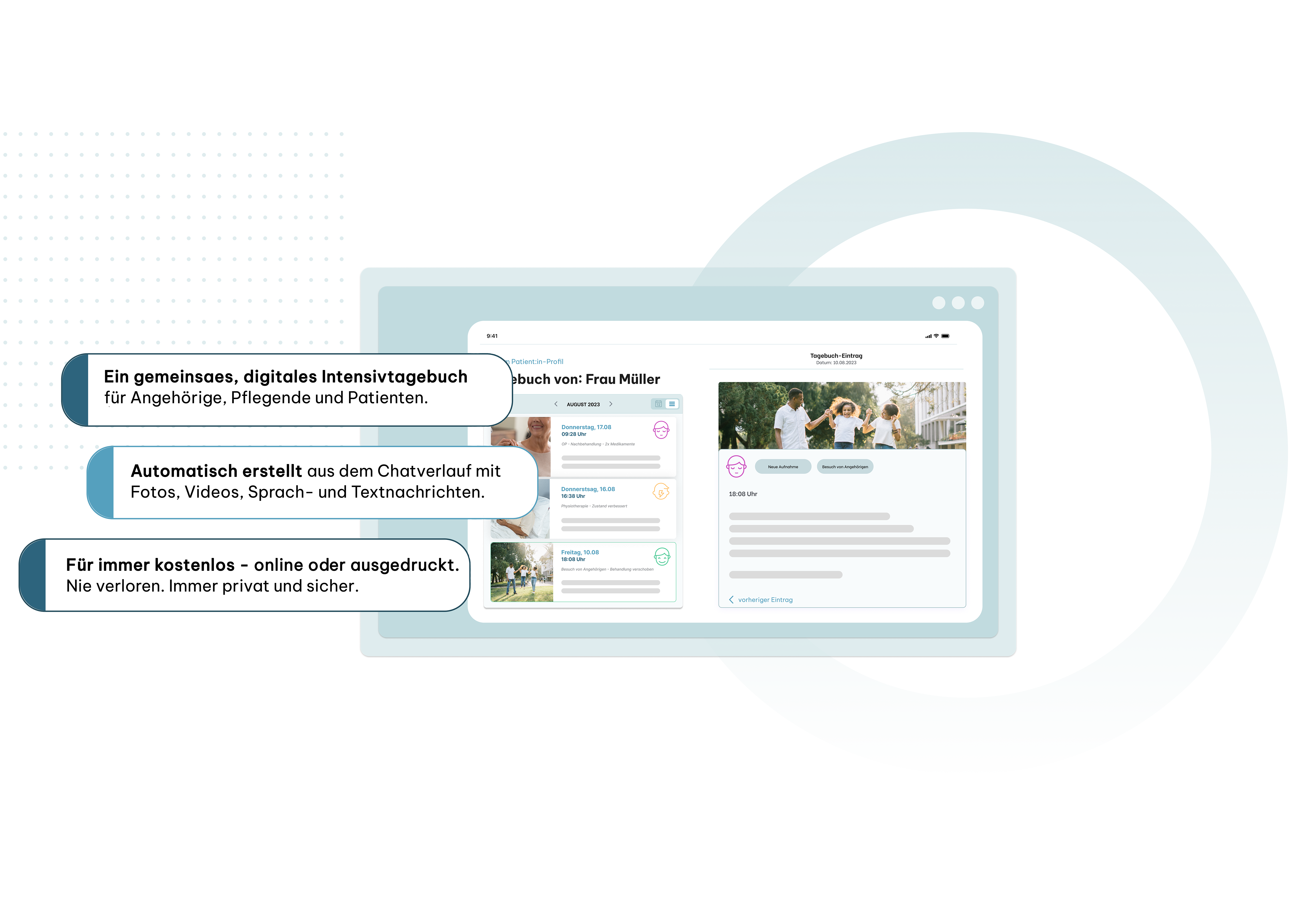 Nach Entlassung gehört das Tagebuch dem Patienten und kann gespeichert und ausgedruckt werden. Es bleibt für immer kostenlos beim Patienten, der einzelne Einträge ausblenden oder Angehörige suspendieren oder hinzüfgen kann.